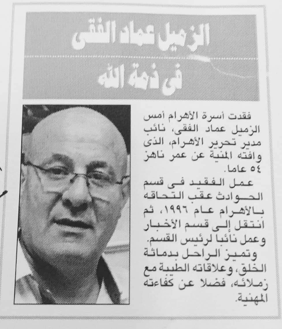 أطلق عليه في الأوساط الصحفية والشعبية المصرية لقب “صحفي الأهرام” وقد اكتسب هذه التسمية من طبيعة عمله كمدير تحرير في مؤسسة الأهرام بمحافظة القاهرة، إنه الصحفي عماد الفقي، وحول تفاصيل انتحار صحفي الأهرام ذكرت المصادر :