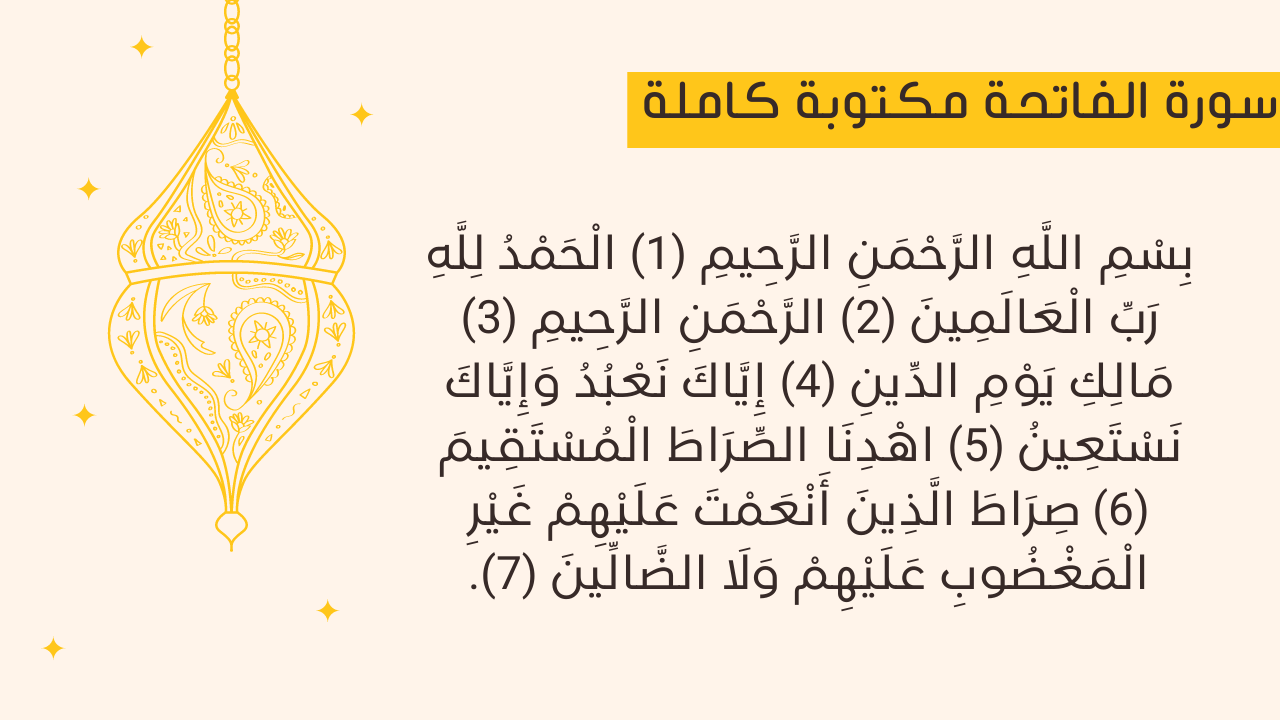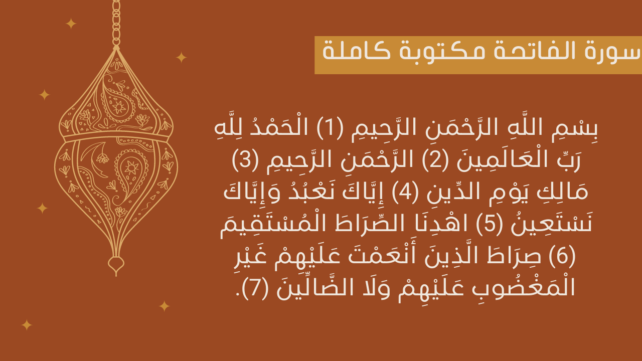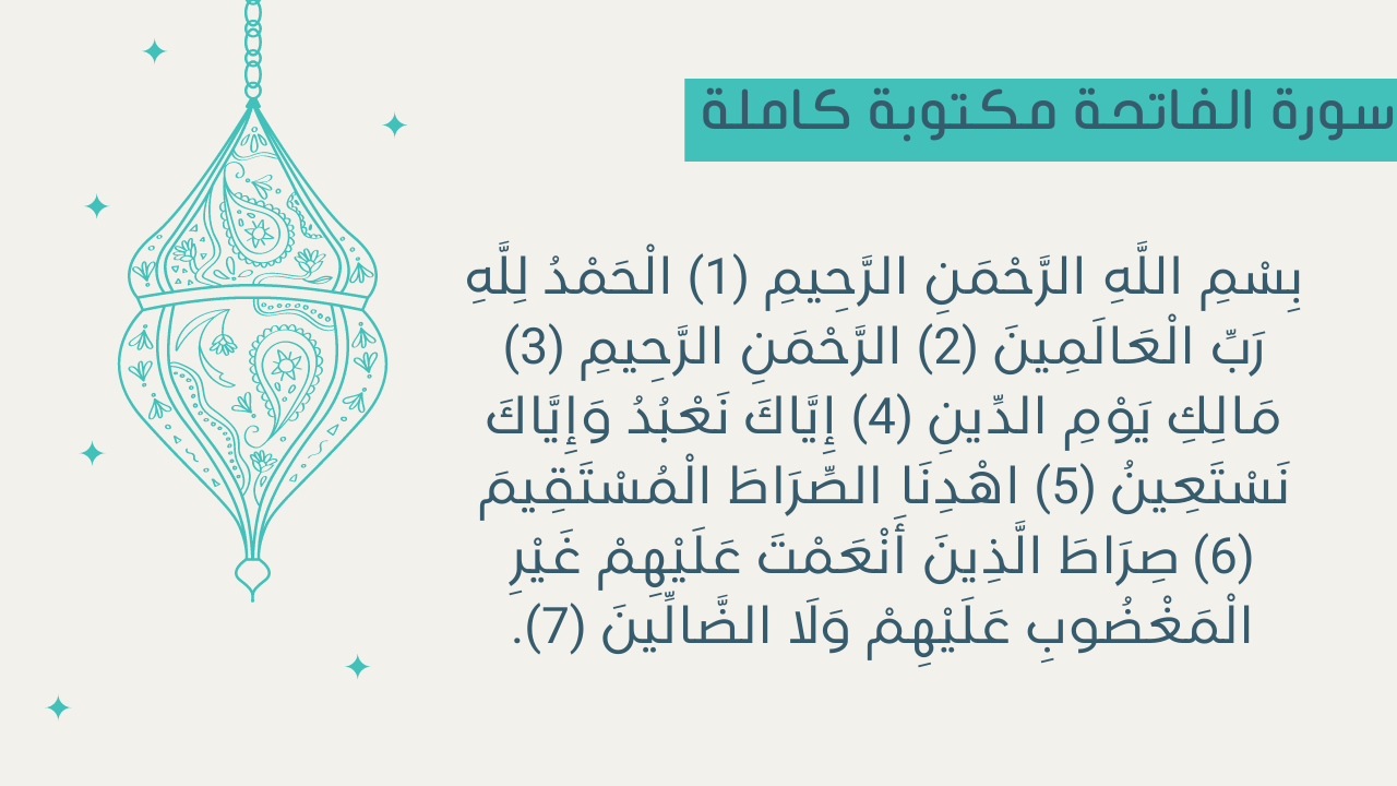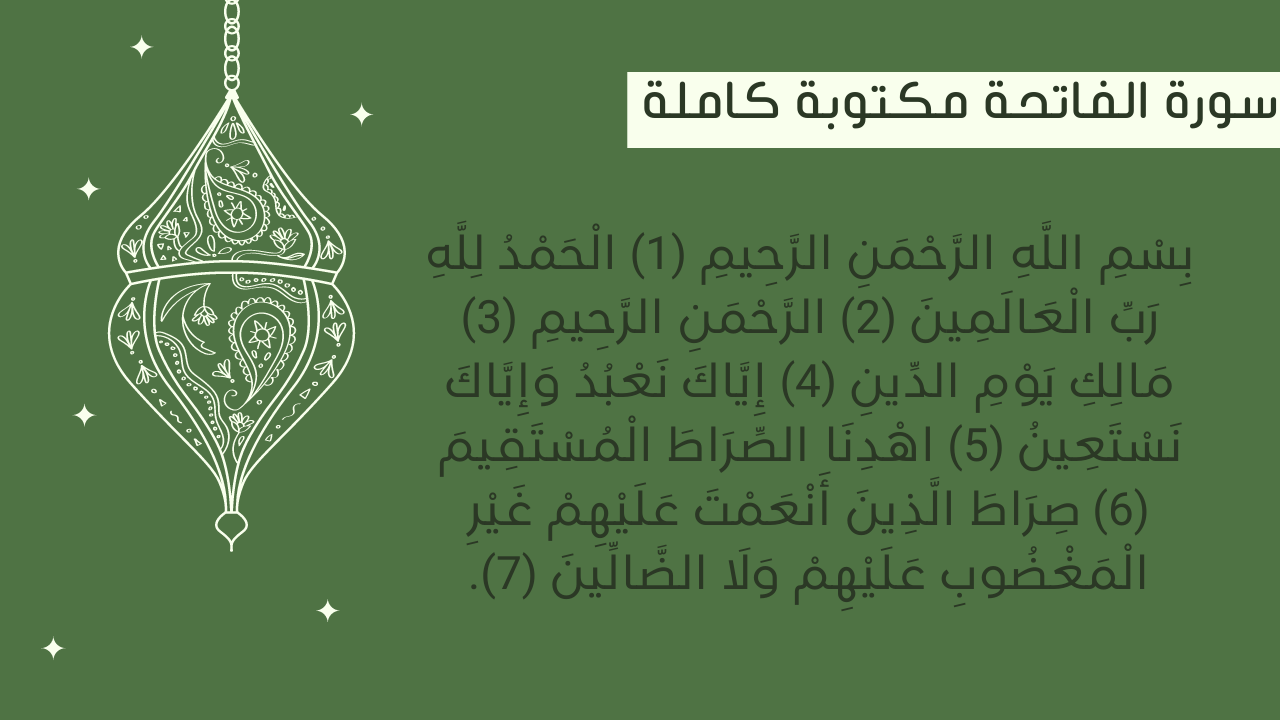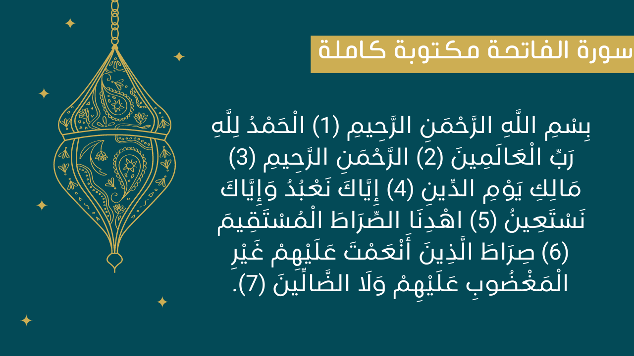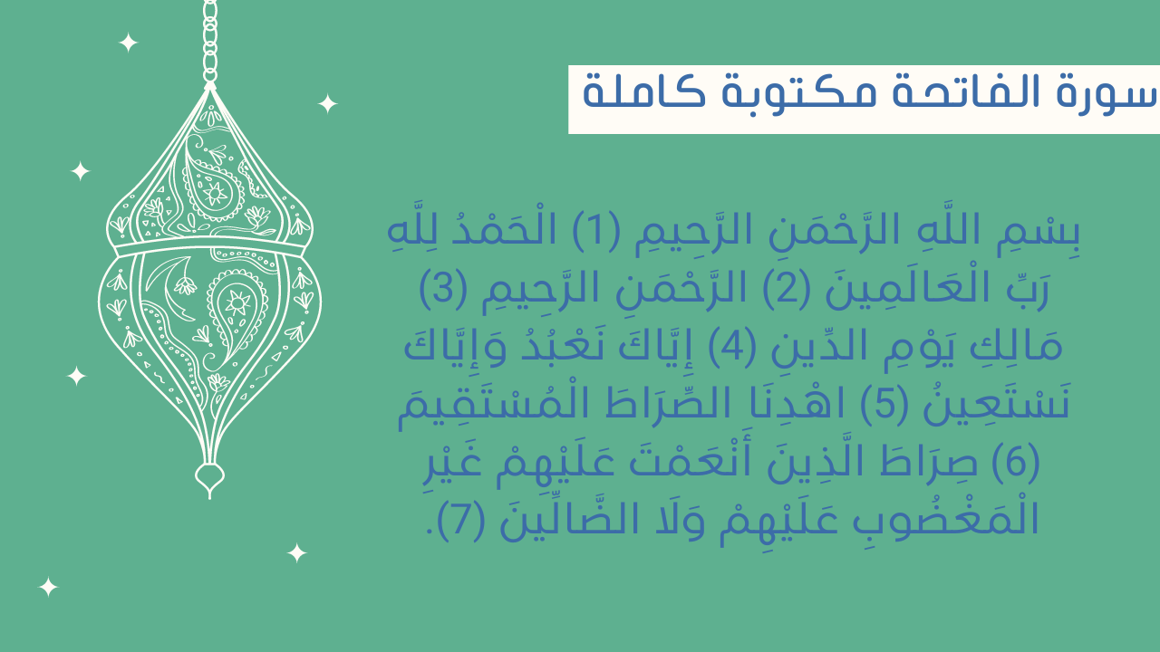- بِسْمِ اللَّهِ الرَّحْمَنِ الرَّحِيمِ (1) الْحَمْدُ لِلَّهِ رَبِّ الْعَالَمِينَ (2) الرَّحْمَنِ الرَّحِيمِ (3) مَالِكِ يَوْمِ الدِّينِ (4) إِيَّاكَ نَعْبُدُ وَإِيَّاكَ نَسْتَعِينُ (5) اهْدِنَا الصِّرَاطَ الْمُسْتَقِيمَ (6) صِرَاطَ الَّذِينَ أَنْعَمْتَ عَلَيْهِمْ غَيْرِ الْمَغْضُوبِ عَلَيْهِمْ وَلَا الضَّالِّينَ (7).