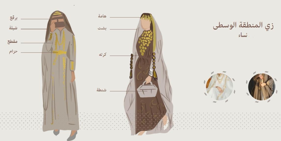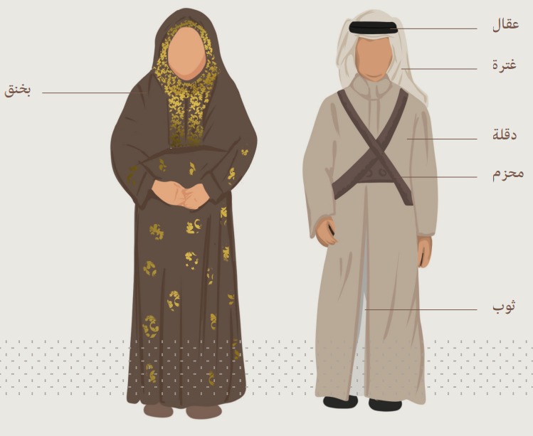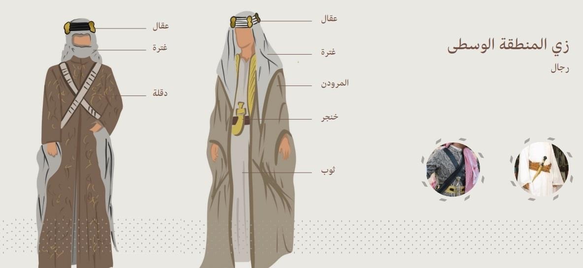 - ملابس المنطقة الوسطى: تكون متمثلة للذكر في العقال والدقلة والمحزم والغترة والثوب، لكل للأنثى تتثمل فيما يعرف بالبخنق.