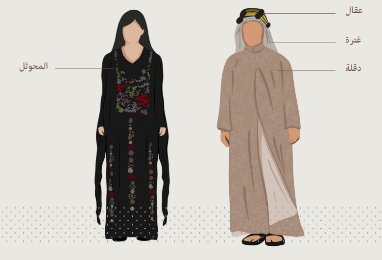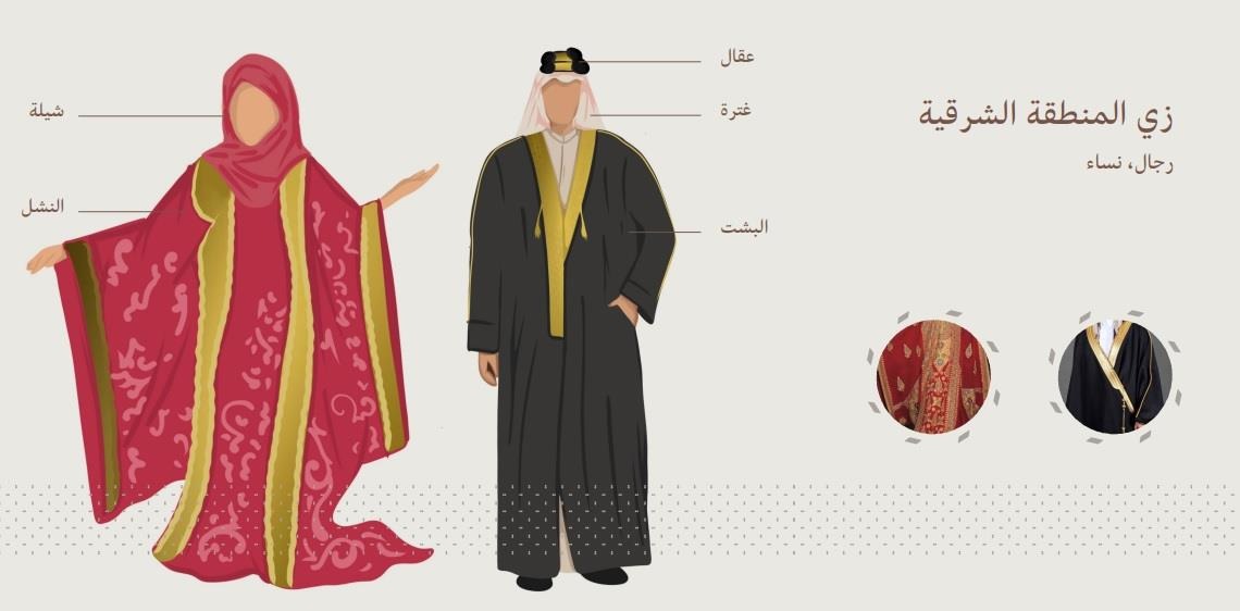 - كذلك، لباس المنطقة الشرقية: يرتدي الذكر الغترة والبشت والعقال، لكن الأنثى ترتدي النشل.
