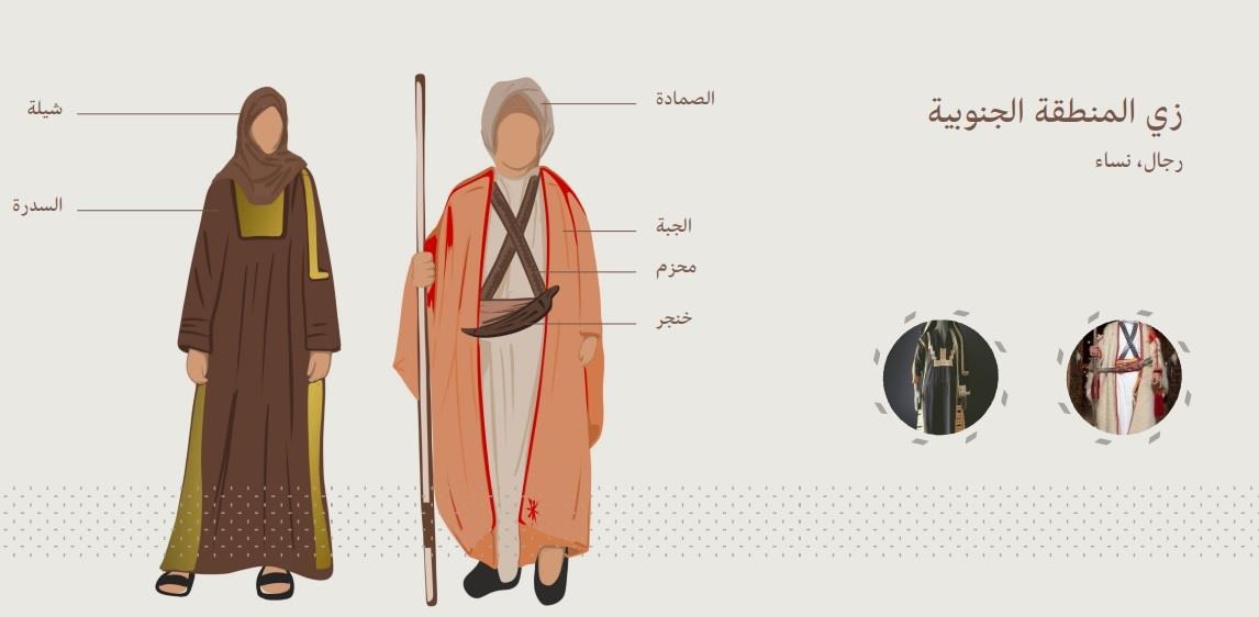 - ملابس المنطقة الجنوبية: يتم ارتداء الذكر الجبة والشبلة، لكن الأنثى تلبس الشيلة والسدرة.
