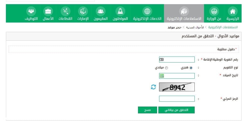 - ثم يجب أن يتم إدخال رقم الهوية، وتاريخ الميلاد، ونوع التقويم، وذلك كي يتم الاستعلام عن حجز موعد الأحوال.