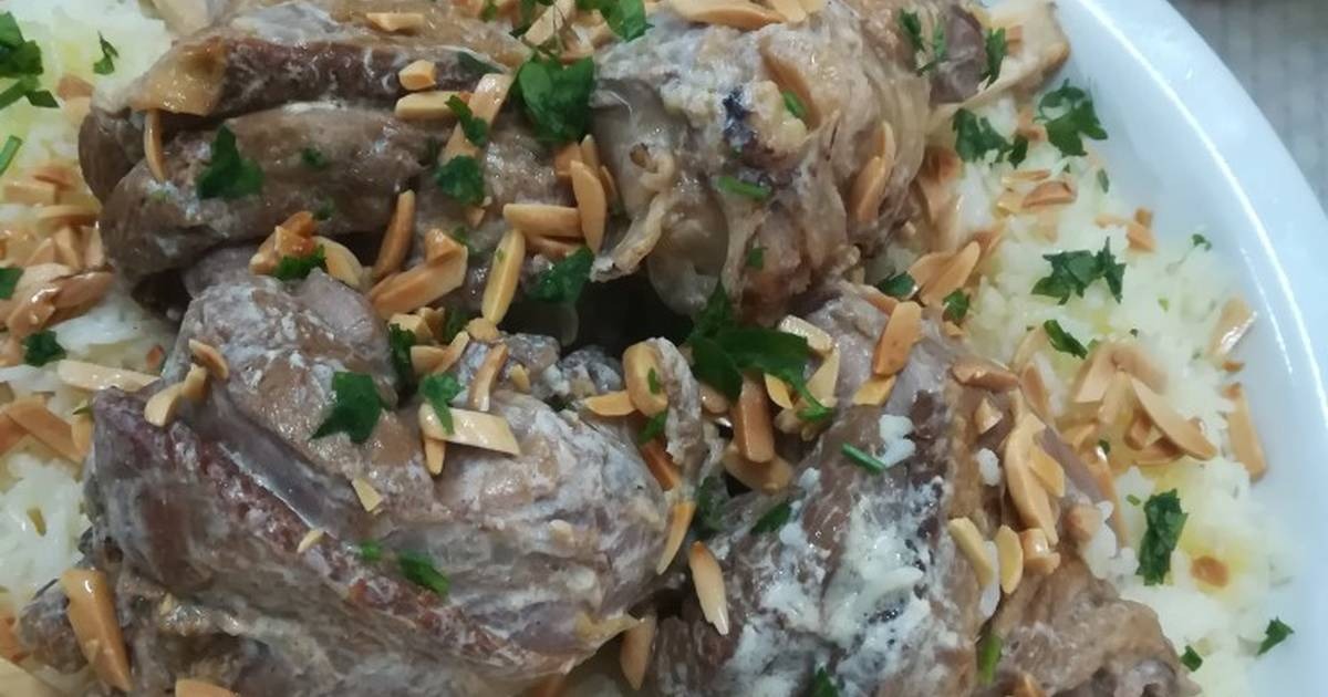 - زيدي على الطبق الأرز، ومن ثم يتم تزيين وجهه بقطع من اللحم، والبقدونس، واللوز، ويقدم إلى جانبه مزيج اللبن.