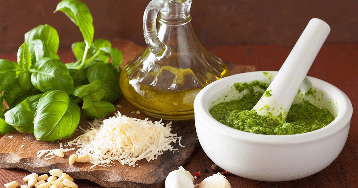 - نقوم بدهن شرائح التوست ورغيف الخبز بصلصلة البيستو.