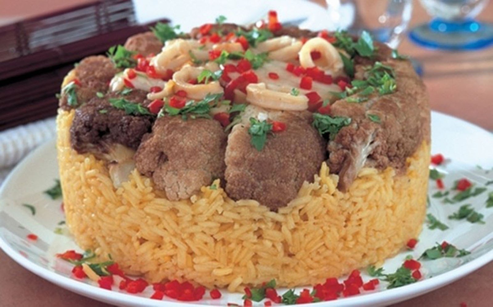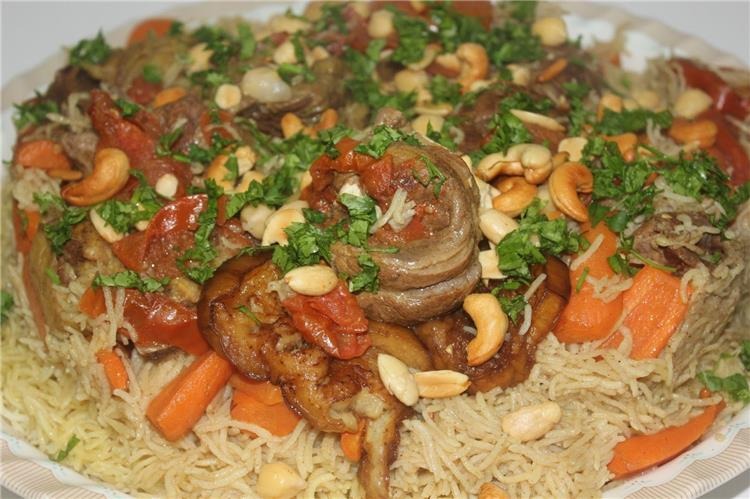 - يتم تصفية الأرز من الماء، ويضاف له اللحم والباذنجان المقلي.