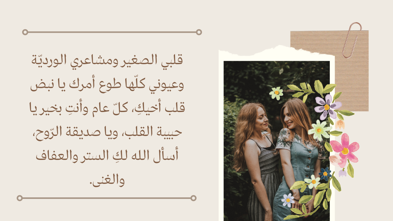 - أختي ليس نسخة عنّي.. إنّما هي أنا في الحقيقة، هي النسخة الأفضل منّي والأكثر كمالًا وصبرًا وهدوء.. كذلك كلّ عام وأنتِ بخير يا مدرستي الصغيرة التي أتعلّم منها قوّتي ومصلحتي.