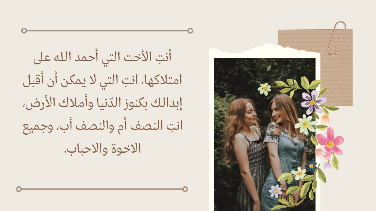الترجمة: إنّ الأخت هي قطعة من الأم ونسخة من الأب. فهي الكمال المطلق لمفهوم العائلة. كلّ عام وأنتِ بخير يا حبيبة قلبي.