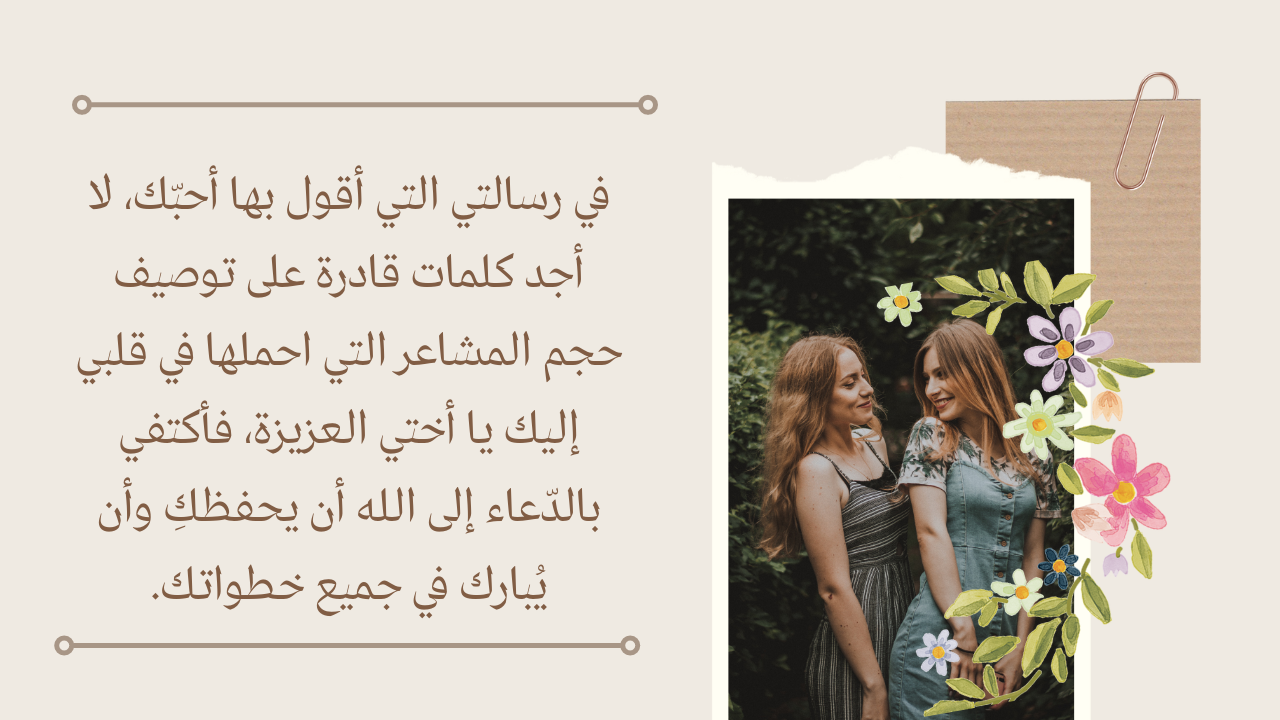 - في رسالتي التي أقول بها أحبّك.. لا أجد كلمات قادرة على توصيف حجم المشاعر التي احملها في قلبي إليك يا أختي العزيزة.. كذلك أكتفي بالدّعاء إلى الله أن يحفظكِ وأن يُبارك في جميع خطواتك.