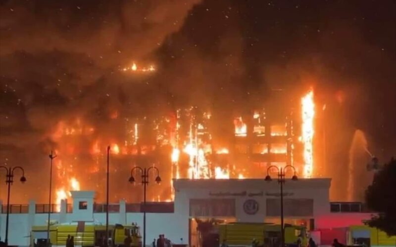- فقد وضحت قوات الحماية المدنية أن الحريق قد التهم المبنى بشكل كامل، وقد التهمت ألسنة النيران كافة الطوابق في المبنى.