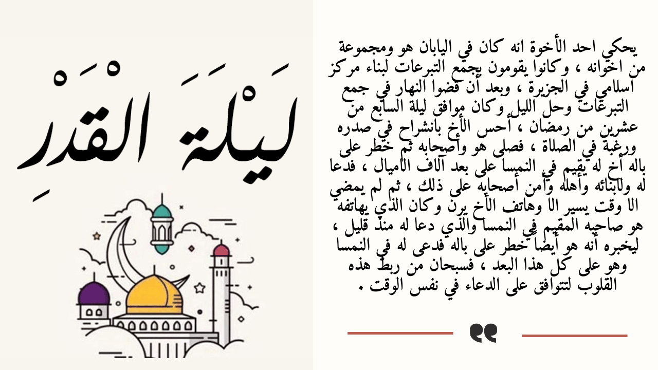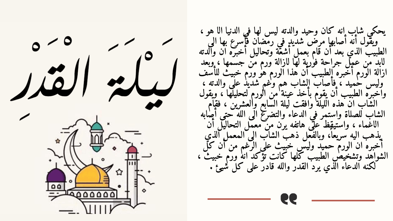 - تحكي هذه القصة عن رجل شعرت والدته في احدى ليالي العشر الأواخر من شهر رمضان براحة وسكينة غير معتادة أبداً.