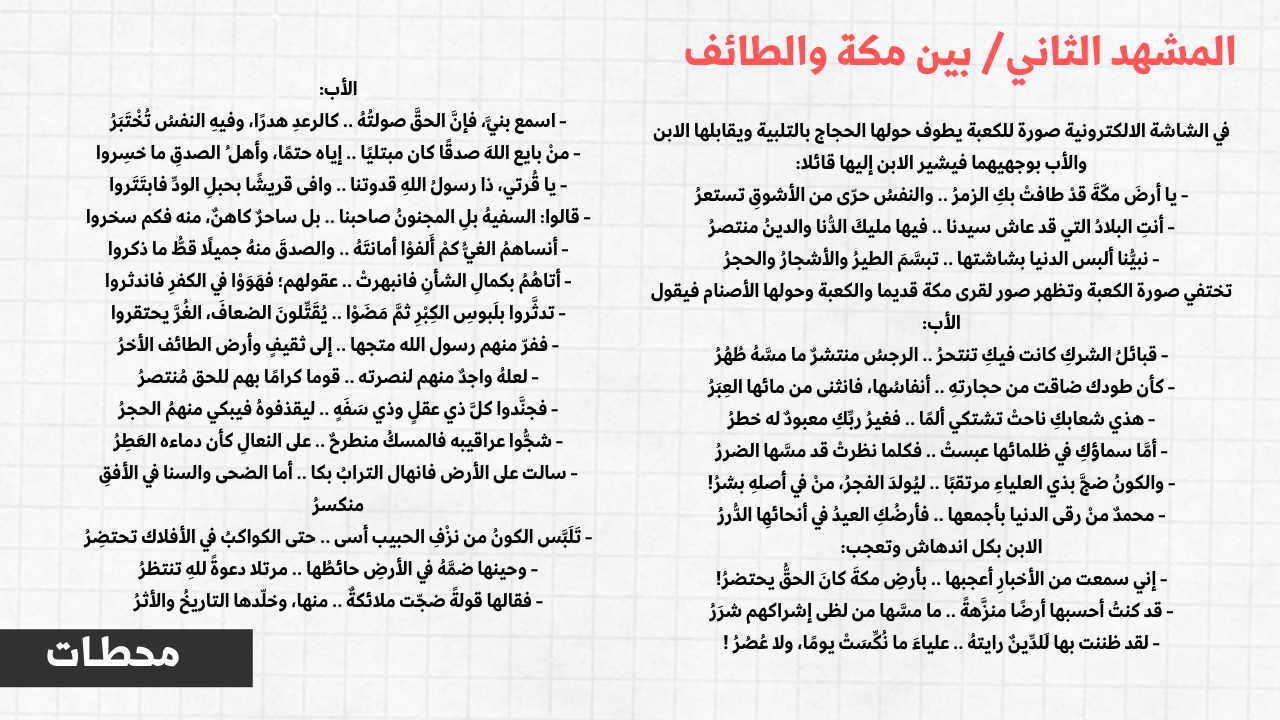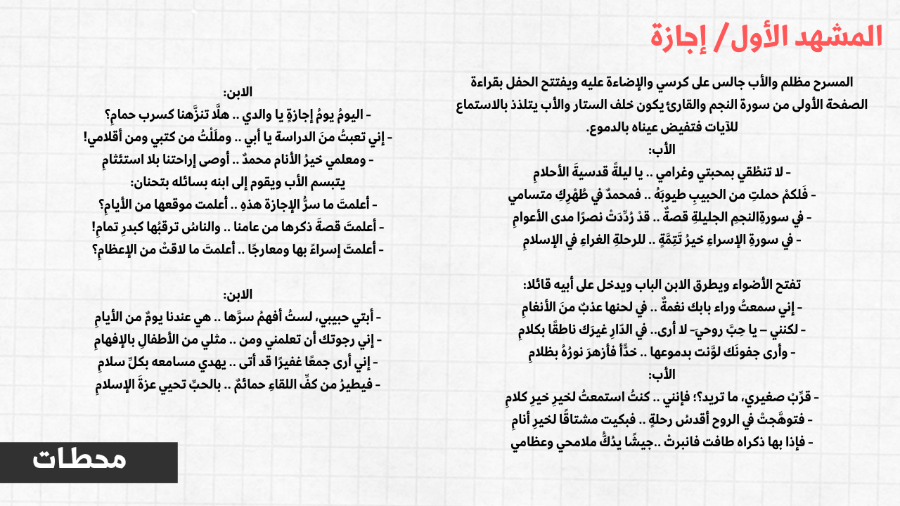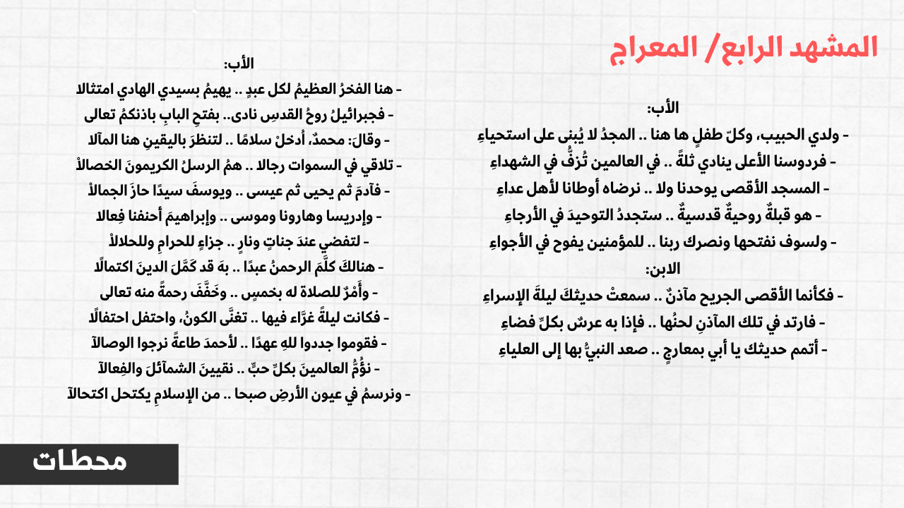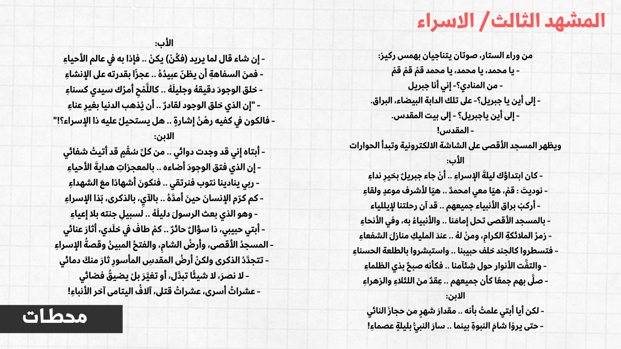يتم تقديم الكثير من المسرحيات بمناسبة الاسراء والمعراج، وهذه المسرحيات تحمل في مضمونها الكثير من المعاني المهمة التي يجب تسليط الضوء عليها والتركيز بشكل كبير على كل تفاصيلها، كذلك يمكن من خلال هذه المسرحيات توصيل الفكرة التي تدور حولها معجزة الاسراء والمعراج، والتي تدلل على قدرة الله واعجازه، واسراء النبي من المسجد الحرام للمسجد الأقصى، وفي هذا السياق نرفق مسرحية الاسراء والمعراج مكتوبة: