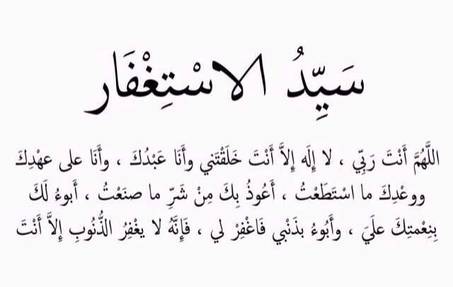 - عن النبي محمد صلى الله عليه وسلم قال: “اللهم انت ربي لا اله الا انت خلقتني وانا عبدك وانا على عهدك ووعدك ما استطعت اعوذ بك من شر ما سمعت ابوء لك بنعمتك علي وابوء بذنبي فاغفر لي فانه لا يغفر الذنوب الا انت”.