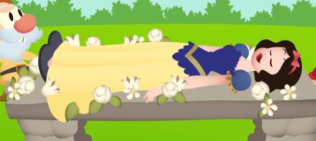 بعدها لبست الساحرة ثياب غير ثيابها وغيرت من شكلها وتوجهت الى الغابة، ووجدتها فعندها اعطتها تفاحة مسمومة، وعندما تناولت التفاحة قد وقعت على الأرض، وظن حينها الأقزام أن بياض الثلج قد ماتت عندما وقعت على الأرض، وحزنوا عليها حزن شديد وقاموا بوضعها في تابوت زجاجي، وكانوا يتناوبون على حراستها وحمايتها، وقد كان مر من هناك أمير كان قد مر من الغابة ووجد بياض الثلج وهي ممدة فأعجب بشكل كبير ببياض الثلج، وعندما طلب من الأقزام أن يعطوه التابوت مقابل أي شيء مادي يردوه، ولكن الأقزام لم يقبلوا نهائياً، ولكن أشفقوا على حالة بياض الثلج بشكل كبير، فحمل الحراس التابوت، وعند سير الحراس في الغابة قد تعثروا بشجرة، فحينها اهتز التابوت ووقعت بياض الثلج على الأرض وسقطت من فمها التفاح المسموم، فعندها خرجت بياض الثلج من غيبوبتها.