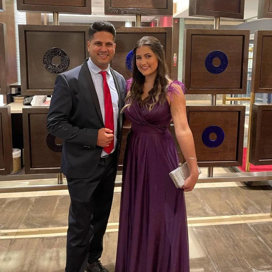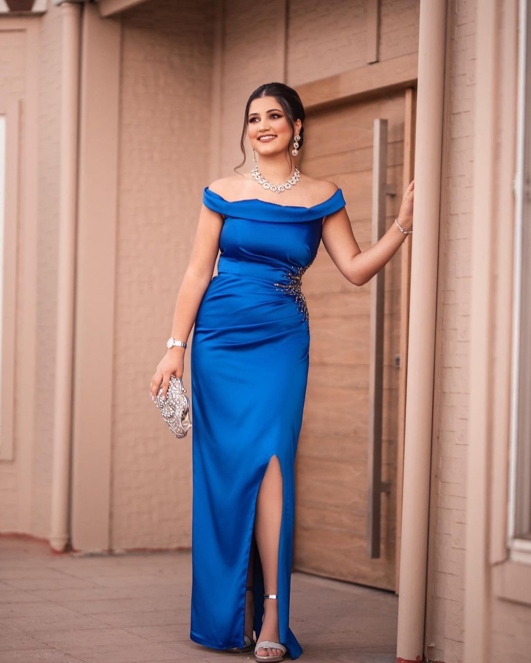 لقد كانت ترتدي لين فستانا من الساتان وكان باللون الأزرق، حيث كان مشكوف من الأعلي بشكل واضح، وكما انه مفتوح من الخلف، وكان مطرز بالخرز اللامع عند الخضر من الاتجاه الأيسر، وكذلك كانت فتحة الفستان تصل الي الركبة.