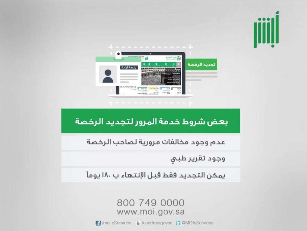 - يجب أن يكون للمواطن الذي يرغب بتجديد الرخصة حساب على منصة أبشر.