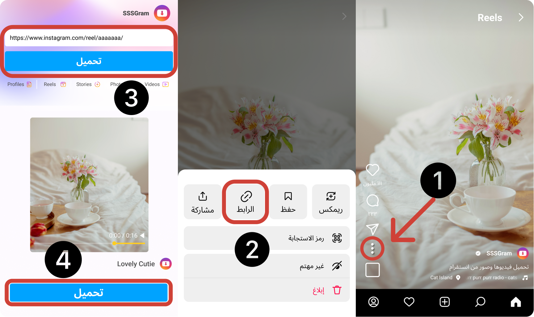 ادخل الانستقرام وابحث عن فيديو الريلز الذي تريد تنزيله على جهازك. ثم اضغط على زر النقاط الثلاث وحدد الخيار “ارتباط” للحصول على الرابط ونسخه. بعد ذلك، افتح SSSGram، والصق رابط فيديو الريلز في مربع البحث، وانقر على زر التنزيل القريب.