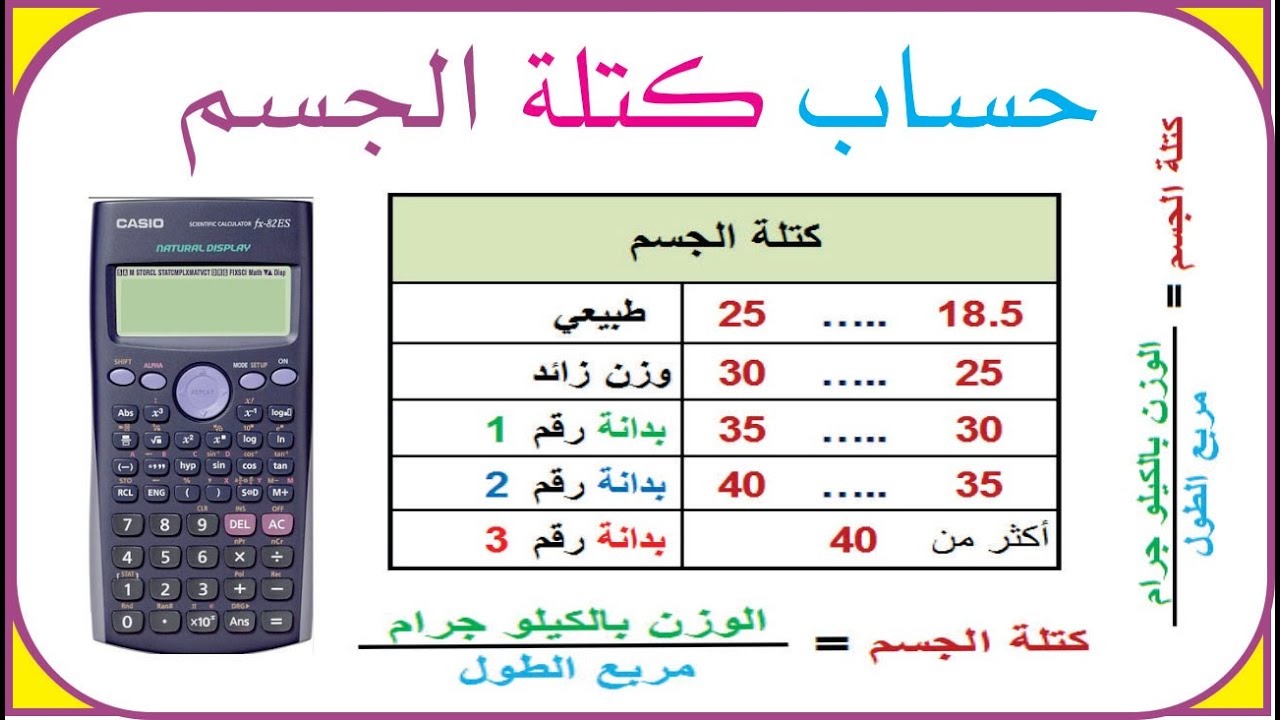 - مؤشر كتلة الجسم (BMI )= الطول بالمتر X الطول بالمتر / وزن الجسم بالكيلوغرام (يرجى قراءة المعادلة من اليسار إلى اليمين).