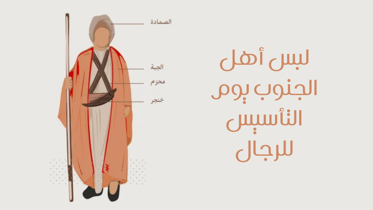 لبس اهل الجنوب يوم التأسيس مميز بتميز الدولة السعودية الأولى التي أُقيمت على يد الإمام محمد بن سعود والذي أعطى العالم اثباتاً قوياً على أن الشعب السعودي شعب لا تهزمه الظروف أبداً.