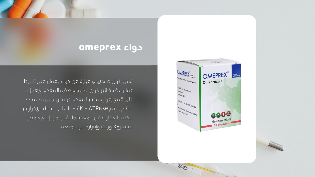 - كذلك يعمل دواء omeprex حيث أنه يساعد على تثبيط عمل مضخة البروتون الموجودة في المعدة>