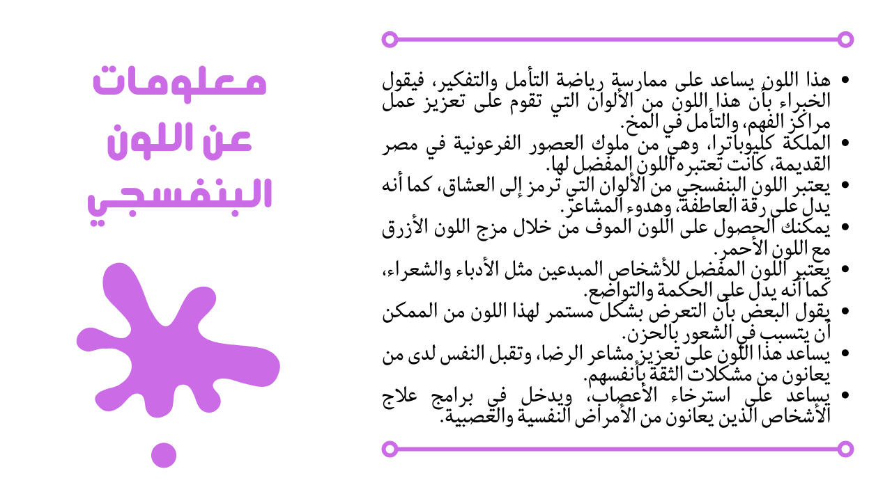- يقال عن اللون البنفسجي إنه لون ملكي يحمي النفس ويساعدها على تحقيق الأفضل.