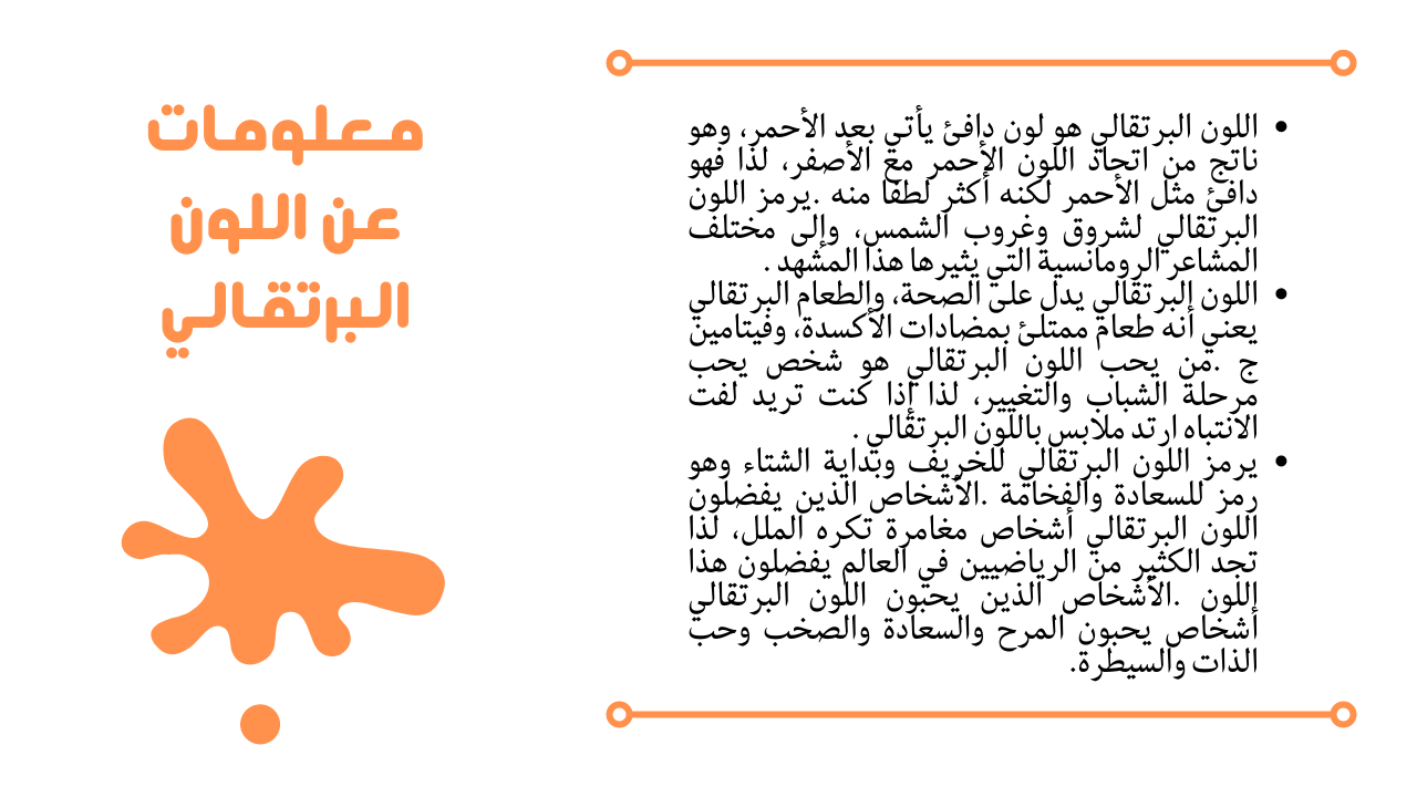 - كذلك البرتقالي هو لون الحياة المحببة والحيوية.. إنه يثير حماسًا ومشاعر حيوية في الداخل.