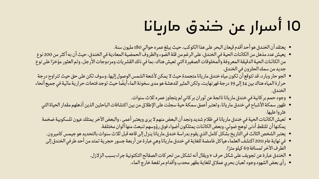 - عمق خندق ماريانا 11.03 كيلومتر تحت سطح البحر.
