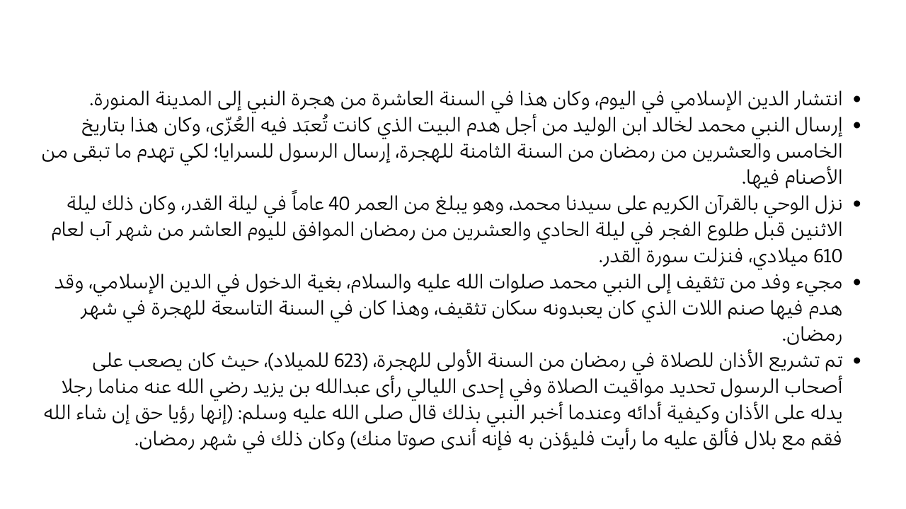 - حدثت غزوة فتح مكة في شهر رمضان المباركة في السنة الثامنة من الهجرة النبوية.