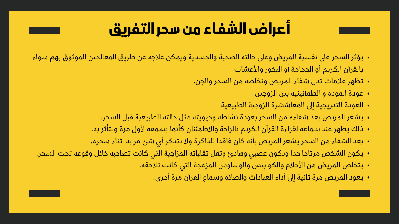 تتعدد أعراض الشفاء التي يشعر بها المصاب بسحر التفريق، وهذه الأعراض تبدأ بعد ملازمة القرآن الكريم، والرقية الشرعية، حيث تتدفق السكينة في روح المسلمين تبعاً لهذا الأمر ومن بينها ما يلي: