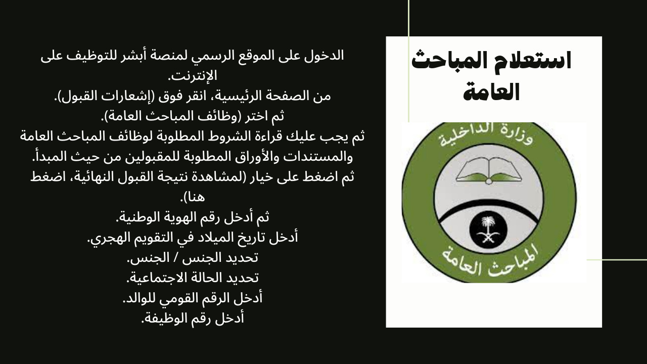 - لهذا على كافة الأشخاص الذين تتوافر لديهم كافة الشروط والمعايير المدرجة من ضمن لوائح وأنظمة المباحث العامة المسارعة في التسجيل لكي يتسنى لهم الفرصة في الحصول على الوظائف المتاحة فيها.