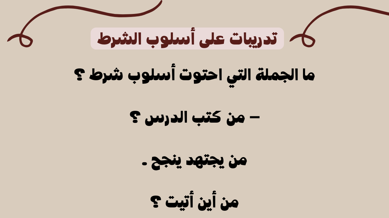 بعد أن قدمنا الشرح المفصل عن أسلوب الشرط، وذكرنا أمثلة عليه، وتطرقنا للحديث عن أدوات الشرط وأنواعها الجازمة وغير الجازمة وذكر الأمثلة عليها، فإننا سف ندرج جملة من الأسئلة التي تعد تدريبات على أسلوب الشرط التي منها يتمكن المتعلم من الحكم ان كان قد حصل على المراد وفهم هذا الأسلوب، وتحديد نقاط الضعف ومراجعتها، حيث وردت الأسئلة على أسلوب الشرط كالآتي: