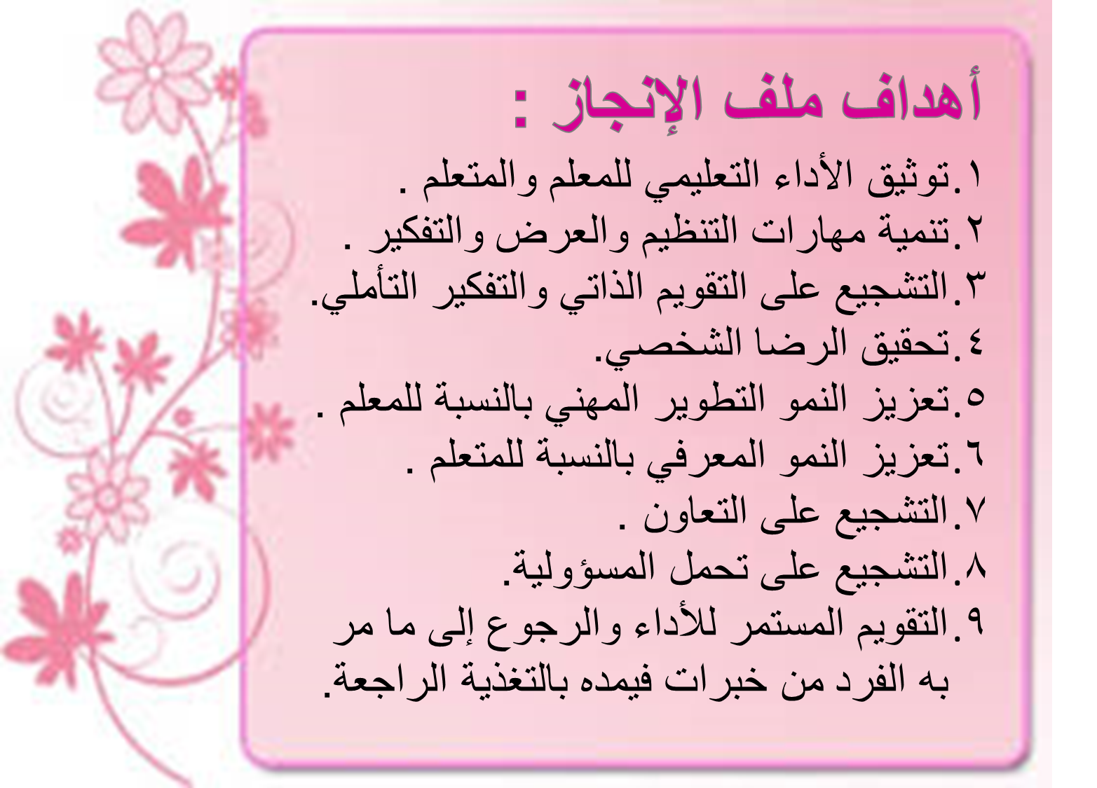 - يقدم ملف الانجاز دليلاً واضحاً علي نمو الطالب وتقدمه في مختلف المواد التعليمية.