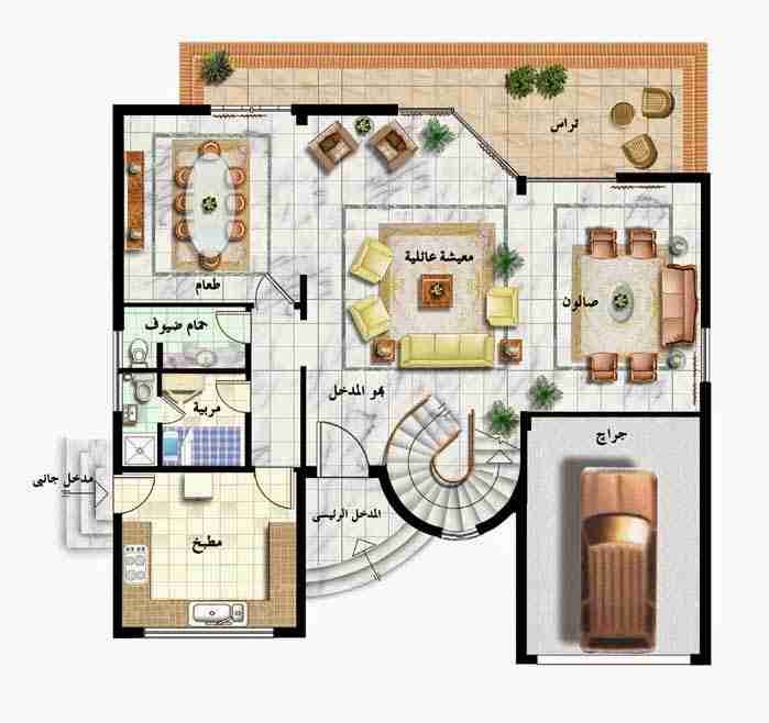 يتكون الدور الأرضي من مكان الاستقبال والانترية والسفرة، كذلك كل من الصالون والمطبخ، وغرفة نوم خاصة للضيوف، والحمام، هنا نوضح لكم عناصر الدور الارضي للفلل الصغيرة التي تكون مساحتها حوالي ثلاثمئة متر مربع، وذلك وفق ما يلي :