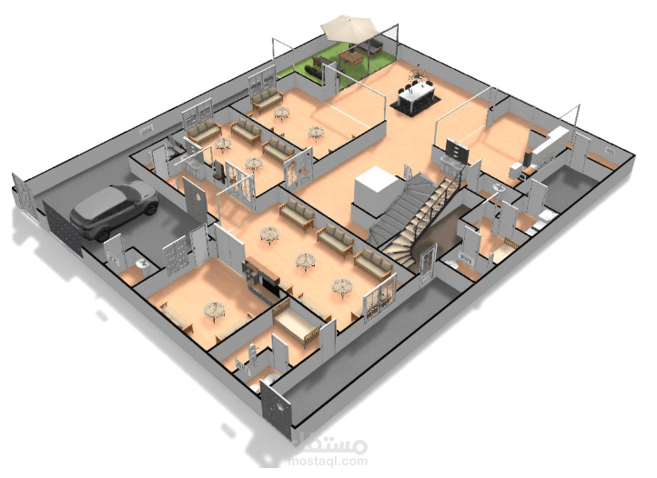 - الحمام : يكون خاص بالضيوف، إذ يخدم كل من مكان الاستقبال والسفرة وغرفة نوم الضيوف.