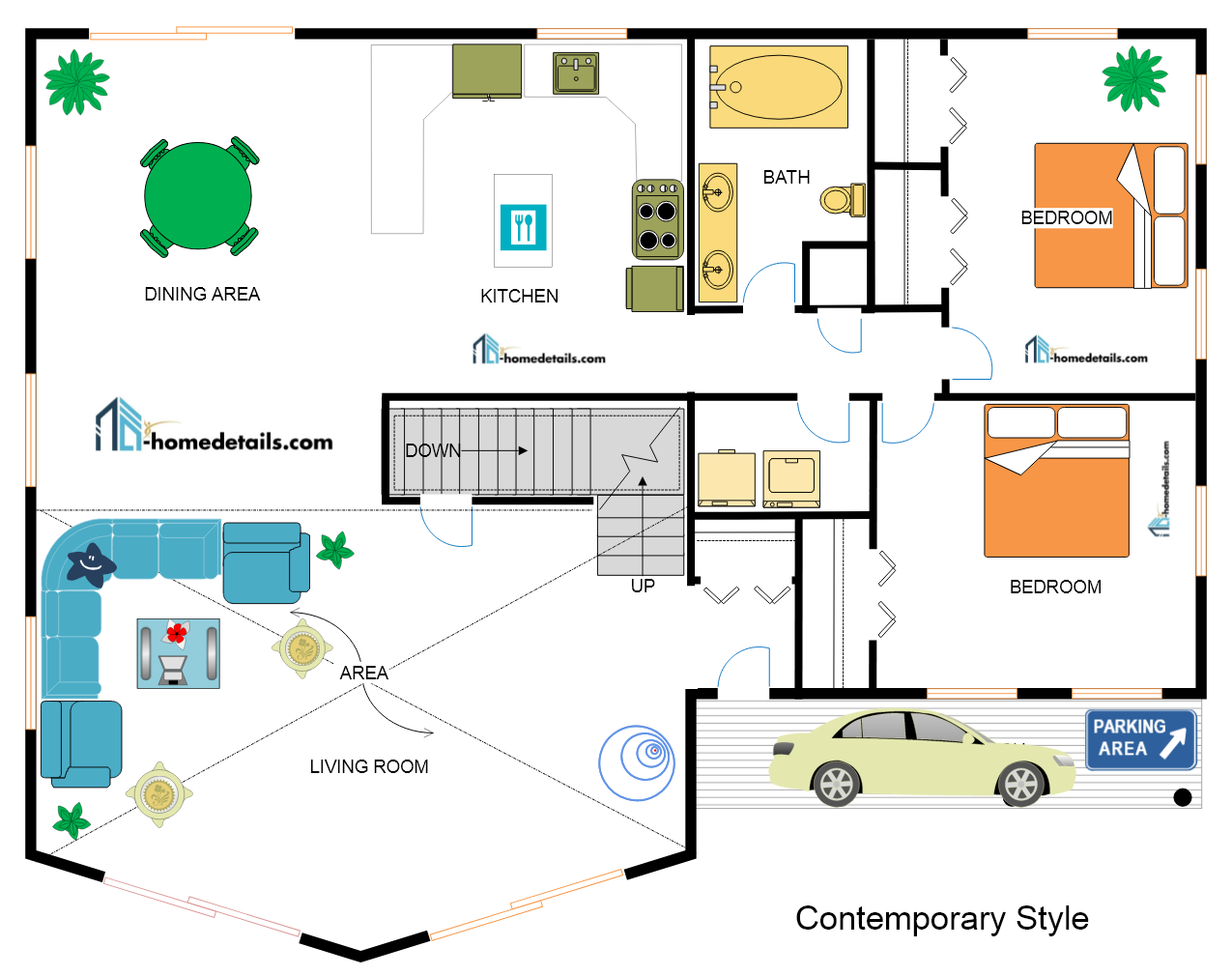 علاوة على ذلك يتم تصميم المرافق الداخلية وغرف النوم وغرف الاستقبال ونحوها، بشكل يتناسب مع عدد أفراد العائلة من جهة، ومع مساحة البيت من جهة أخرى، لذلك فإنه عندما تكون المساحات صغيرة يتم اللجوء إلى تصميم مخططات فلل صغيرة دورين درج داخلي وذلك لتأمين أكبر عدد ممكن من المرافق يلبي احتياجات قاطني البيت.