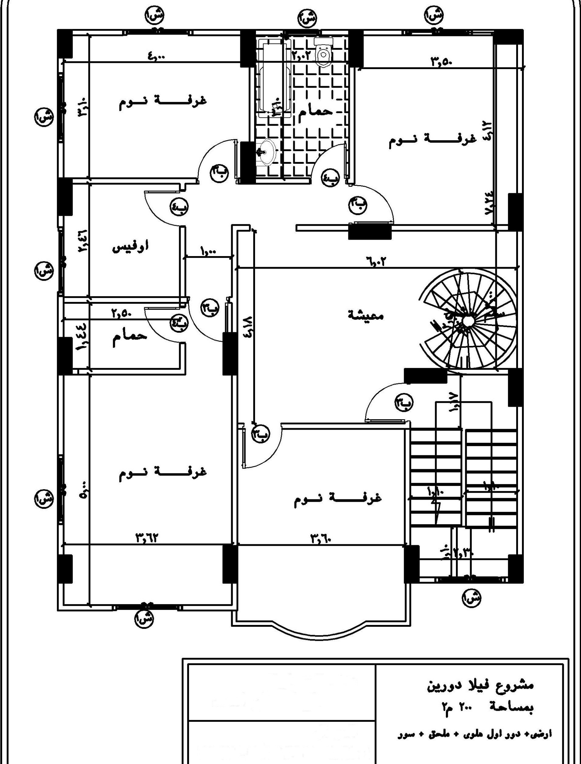 من مشاهدة التلفاز، والجلوس لتبادل أطراف الحديث، على مساحة تصل إلى 34.5 متر مربع. - غرف النوم : توجد في الدور الأول علوي ثلاثة غرف بمساحات متفاوتة، تكون جميعها واسعة حسب الرسومات الظاهرة في التصميم.