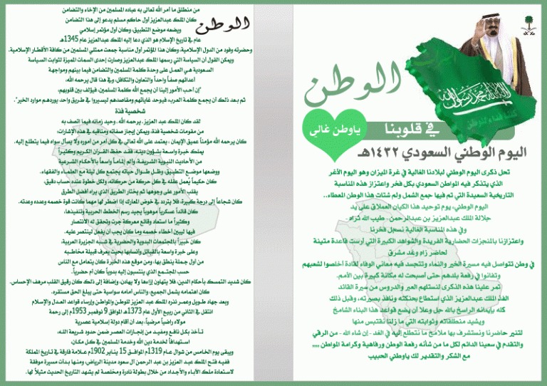 - دام عزّك يا وطني، مبارك اليوم الوطنيّ، يوم توحيد الدّولة السعوديّة تحت اسم المملكة العربيّة السعوديّة على يد الملك الموحد عبد العزيز آل سعود، رحمّه الله وأسكنه فسيح جنّاته.