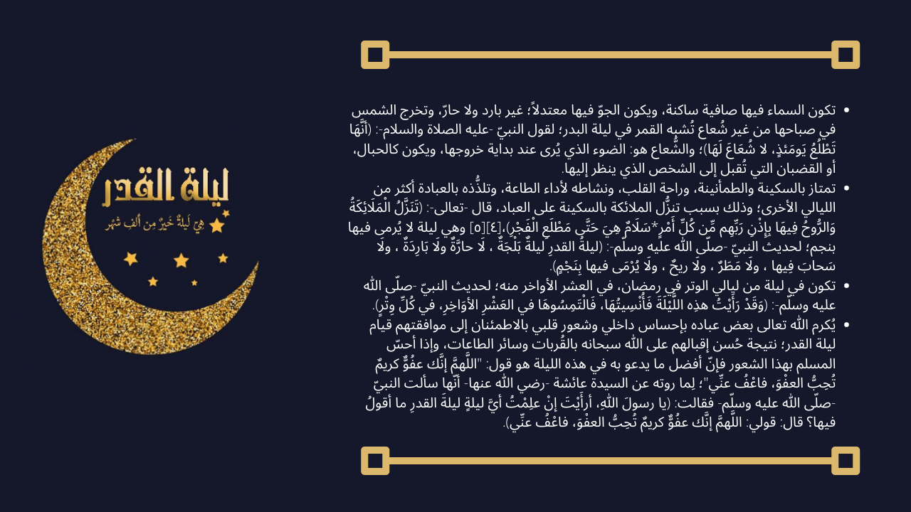 ليلة القدر هي ليلةٌ مباركة حيث أنزل الله القرآن الكريم في هذه الليلة على النبي محمد، حيث قال تعالى: “إنا أنزلناه في ليلة القدر”، بالإضافة إلى أن أجر العبادات والطاعات في هذه الليلة يكون مضاعفاً عن باقي الليالي، كذلك تتنزل الملائكة في ليلة القدر للاستمتاع لأدعية المسلمين المتضرعين والمقبلين على الله، وعلامات ليلة القدر هي: