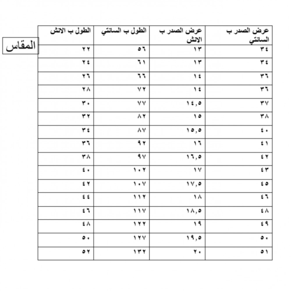 جدول مقاسات ثوب الدفة للرجال