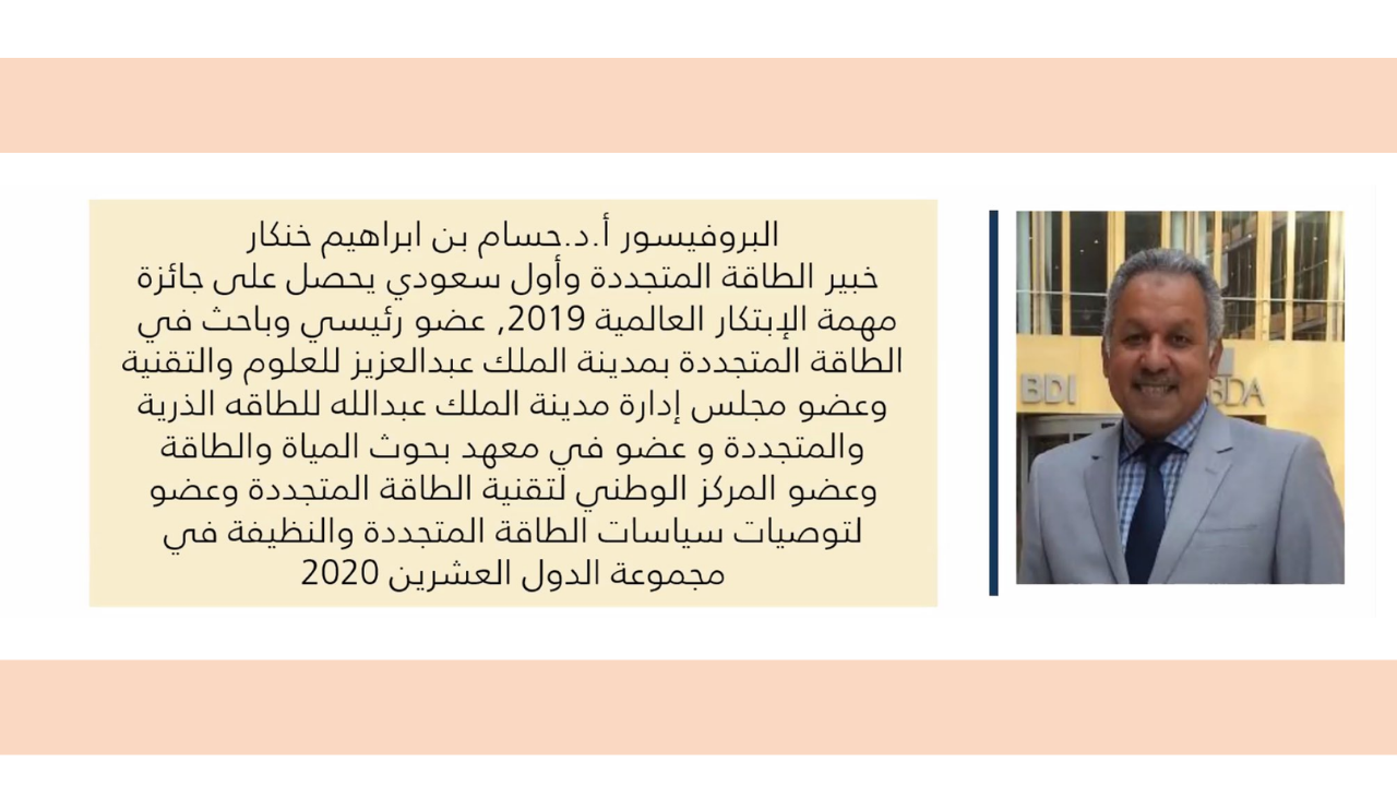 - حسام خنكار بروفيسور سعودي تم اختياره ضمن أهم تسعة عشر عالماً في مجال الطاقة الشمسية.
