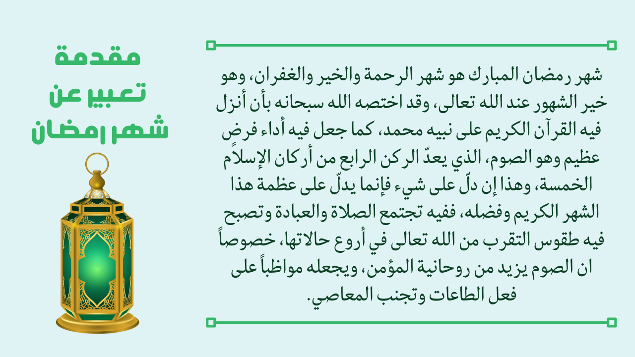 تتضمن المقدمة الخاصة بمواضيع التعبير على الكلمات التعريفية التي توضح للقارئ الفكرة الأساسية لموضوع التعبير، ويجب على المتعلم اتقان كتابة المقدمة كونها البداية التي يبدأ فيها القارئ موضوع التعبير، وفي حال كانت هذه المقدمة جذابة فإن القارئ سيكون متشوقاً لاستكمال قراءة موضوع التعبير، ومن هذا المنحى نرفق مقدمة عن شهر رمضان الكريم مميزة جداً: