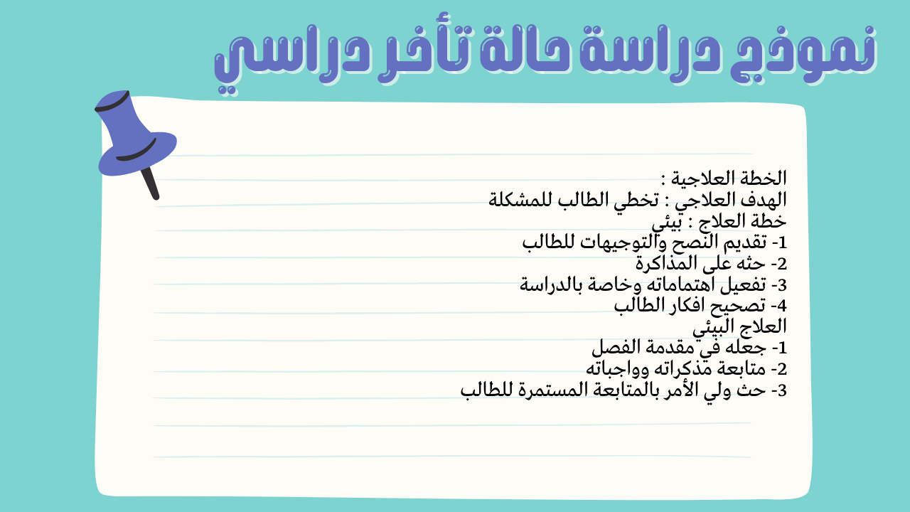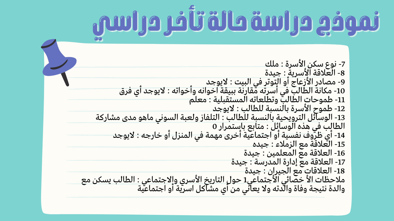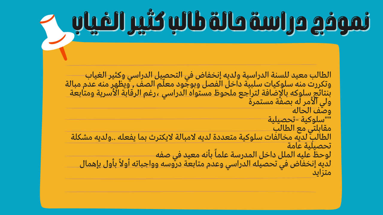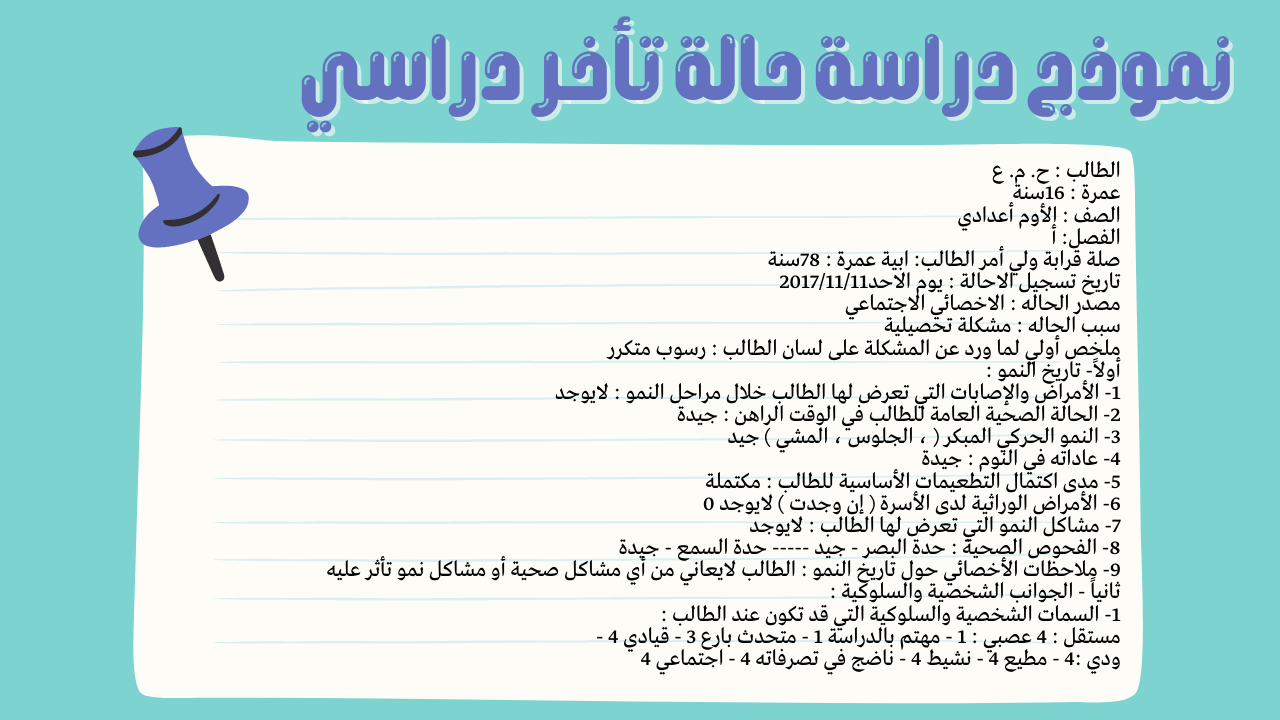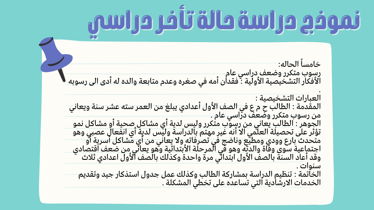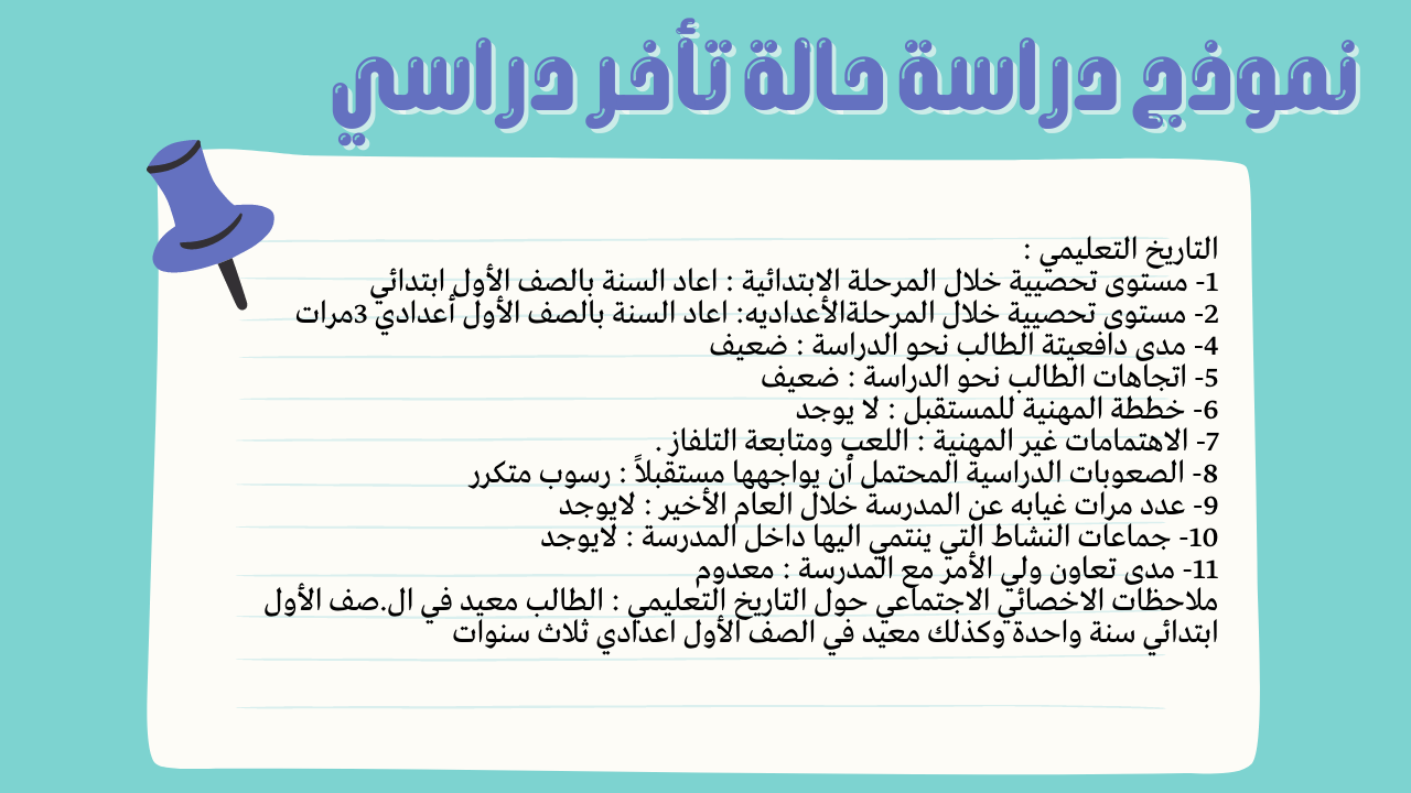 يتولى المرشد الطلابي في المدرسة الكثير من المهام الاساسية والمهمة بشكل كبير، وهذه المهام تتجلى أهميتها في الصور التي تعكسها والتأثيرات التي تأتي بها، والمميزات العديدة التي تتمتع بها، ومن المعروف أن المرشد الطلابي حينما تأتي أنشطته التي يقوم بها بثمارٍ ناجحة فإن الفرحة لن تكون مستوفية جنبات قلبه كلها، ومن ضمن اهم الأمور التي يتولاها المرشد الطلابي دراسة حالة الطلاب، والمُضي قدماً من أجل تقويمها وتحسينها، ولهذا نرفق فيما يلي نموذج دراسة حالة تأخر دراسي: