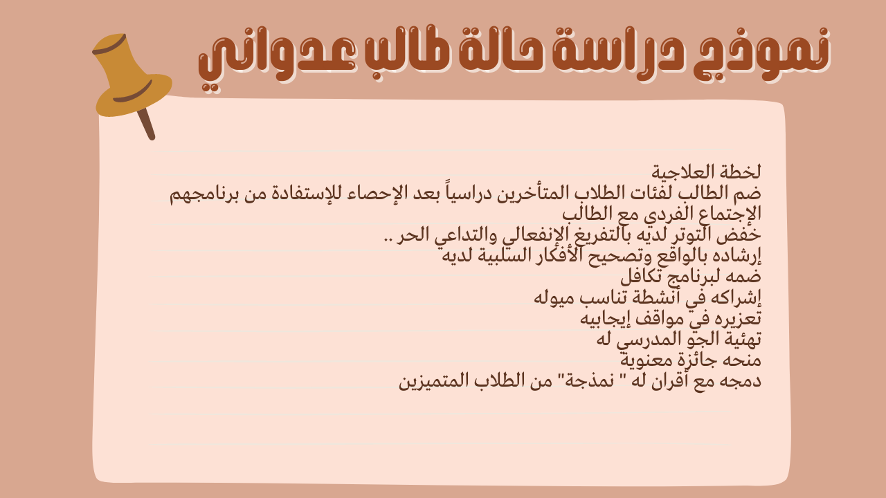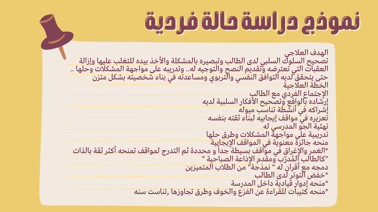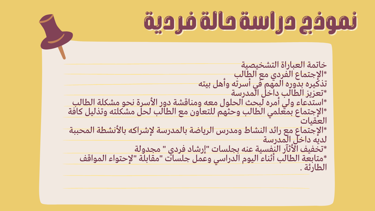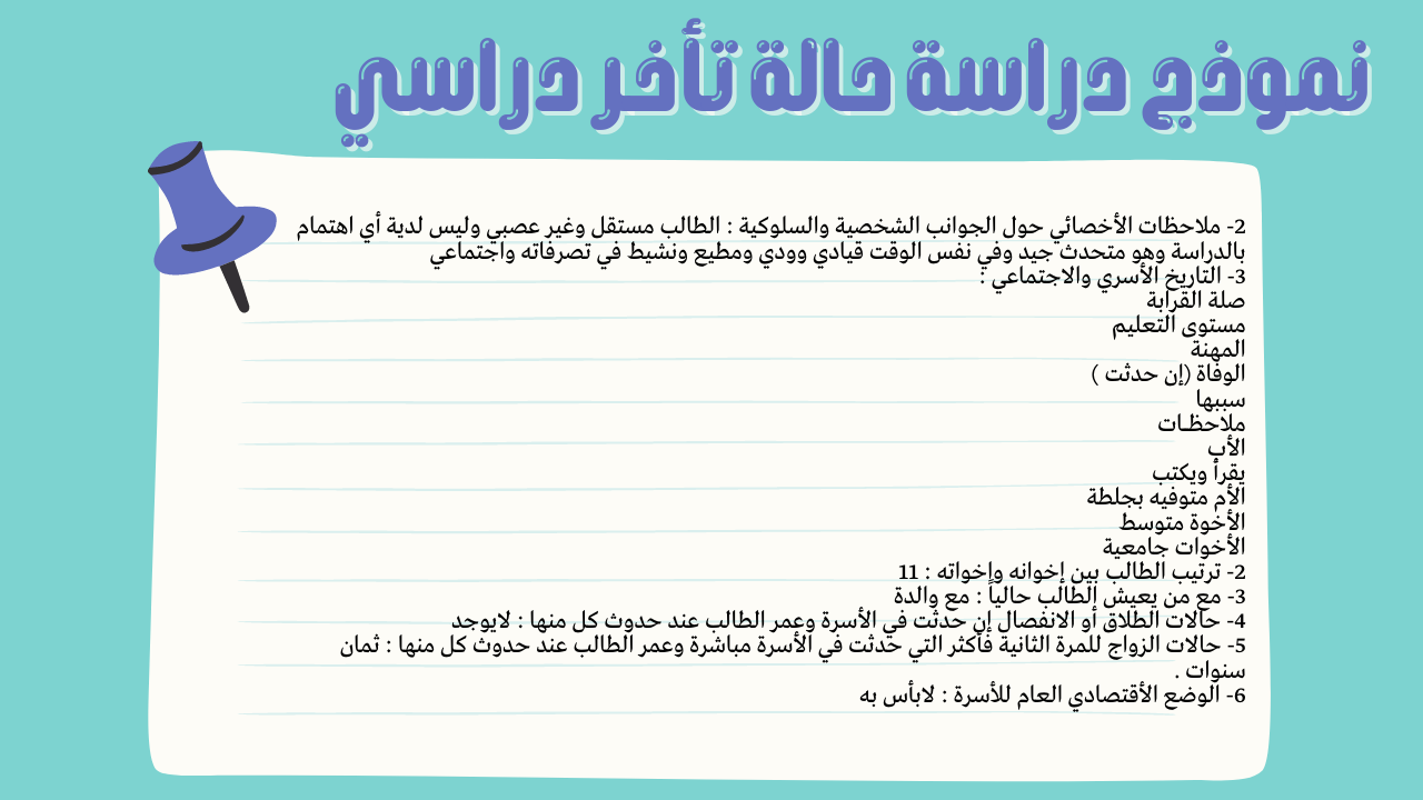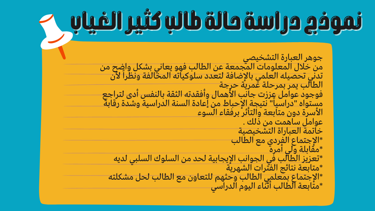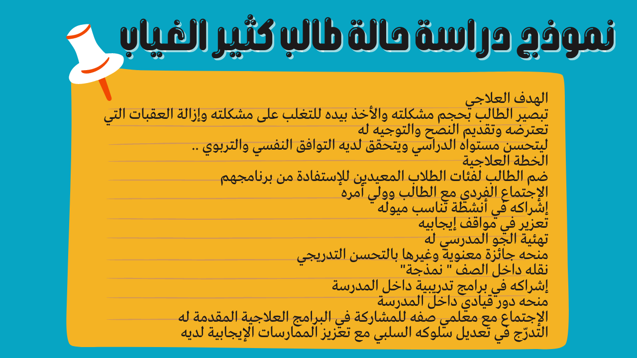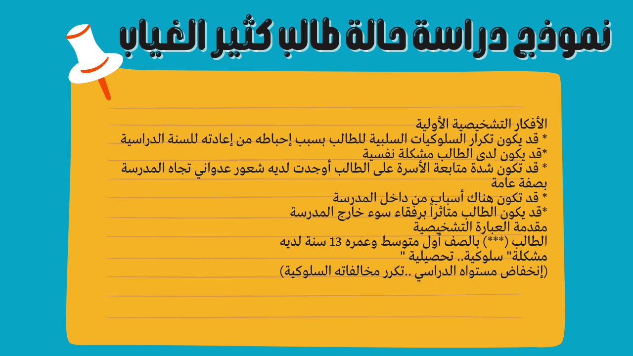 يتولى المرشد الطلابي في المدرسة الكثير من المهام الاساسية والمهمة بشكل كبير، وهذه المهام تتجلى أهميتها في الصور التي تعكسها والتأثيرات التي تأتي بها، والمميزات العديدة التي تتمتع بها، ومن المعروف أن المرشد الطلابي حينما تأتي أنشطته التي يقوم بها بثمارٍ ناجحة فإن الفرحة لن تكون مستوفية جنبات قلبه كلها، ومن ضمن اهم الأمور التي يتولاها المرشد الطلابي دراسة حالة الطلاب، والمُضي قدماً من أجل تقويمها وتحسينها، ولهذا نرفق فيما يلي نموذج دراسة حالة تأخر دراسي: