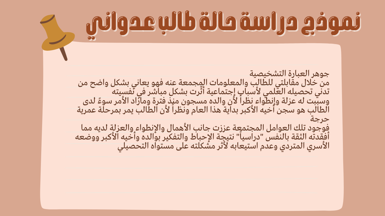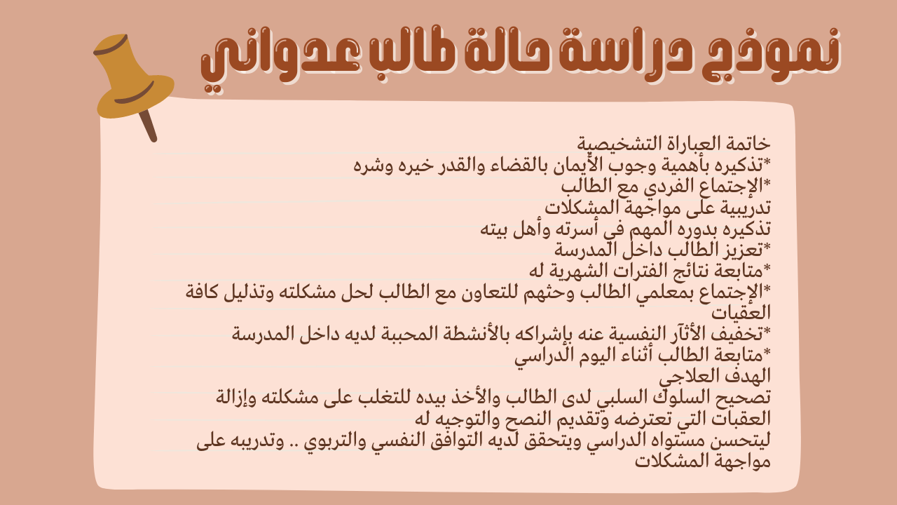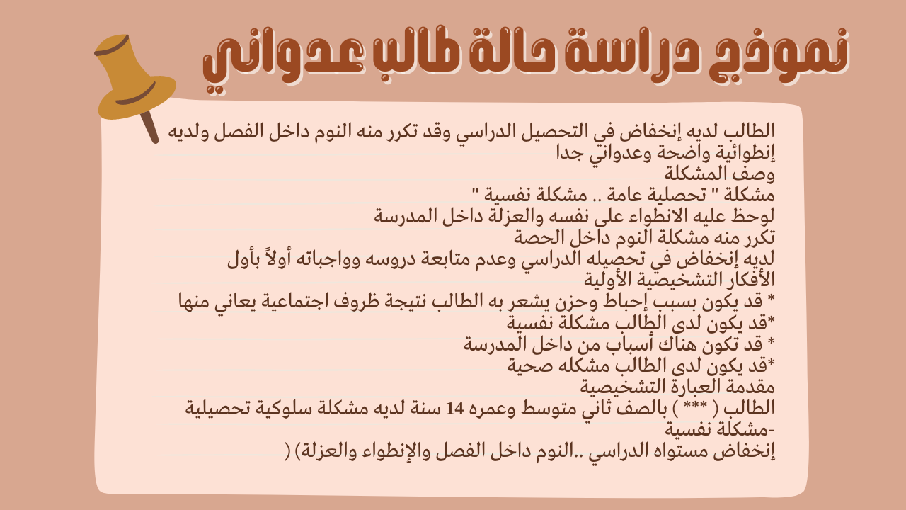تتعد المواقف اليومية الطارئة التي يمكن من خلالها الوصول لحالة الطالب ومعرفتها ودراستها أيضاً، وهذه المواقف يتعرض لها الكثير من الطلاب، وعلى الرغم من كونها تحمل الكثير من التأثيرات على الطالب إلا أنها تغير مجرى حياته، حيث يعمل المرشد الطلابي على دراسة حالة الطالب، وبالتالي ايجاد الثغرات التي تتغلغل في حياته والمساهمة في تلاشيها وتخطيها، حتى يكون الطالب على قدر كبير من الأمان سواء من الناحية العلمية أو العملية، وفي هذا السياق نرفق نموذج دراسة حالة طالب عدواني:
