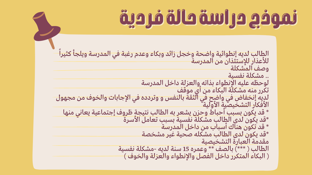 يمكن القول بأن المدرسة لها دور كبير وفعال في اكتشاف الحالة الخاصة بالطلاب، حيث يمكن أن تكون ادارة المدرسة هي المُسلطة للضوء على حالة الطالب، وهذا تبعاً لتحويل الطالب من المعلم للإدارة من أجل تقويم سلوكه وعلاج حالته والبحث في أمرها، وبالتالي يكون هناك دور فعال للمعلم أيضاً فيما يتعلق بهذا الأمر كونه اساس البيئة التعليمية ويلحظ ما يدور فيها من أمور تستدعي الوقوف عندها والحذر منها وتلاشيها أيضاً، ولذلك فإن دراسة حالة الطالب مهمة، وفيما يلي نرفق نموذج دراسة حالة فردية: