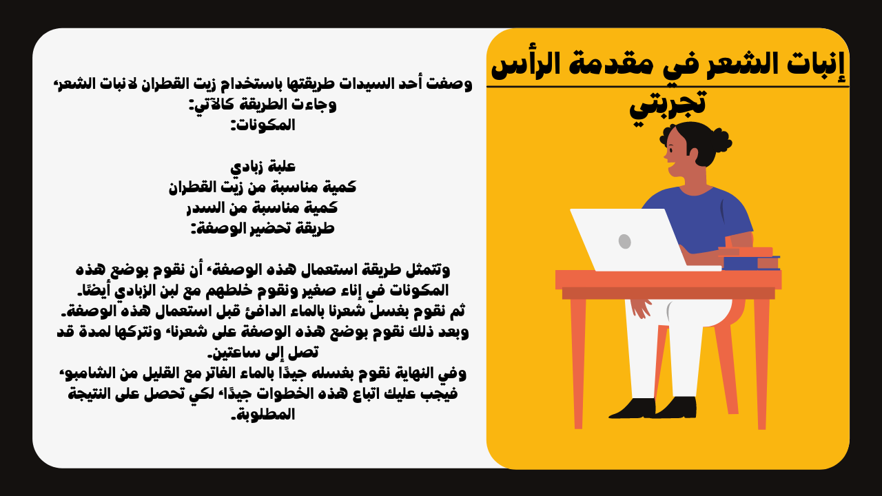 - استمري على هذا مرتين أو ثلاثة في الأسبوع، وسوف تحصلين على انبات الشعر، والتخلص من الشعر التالف.