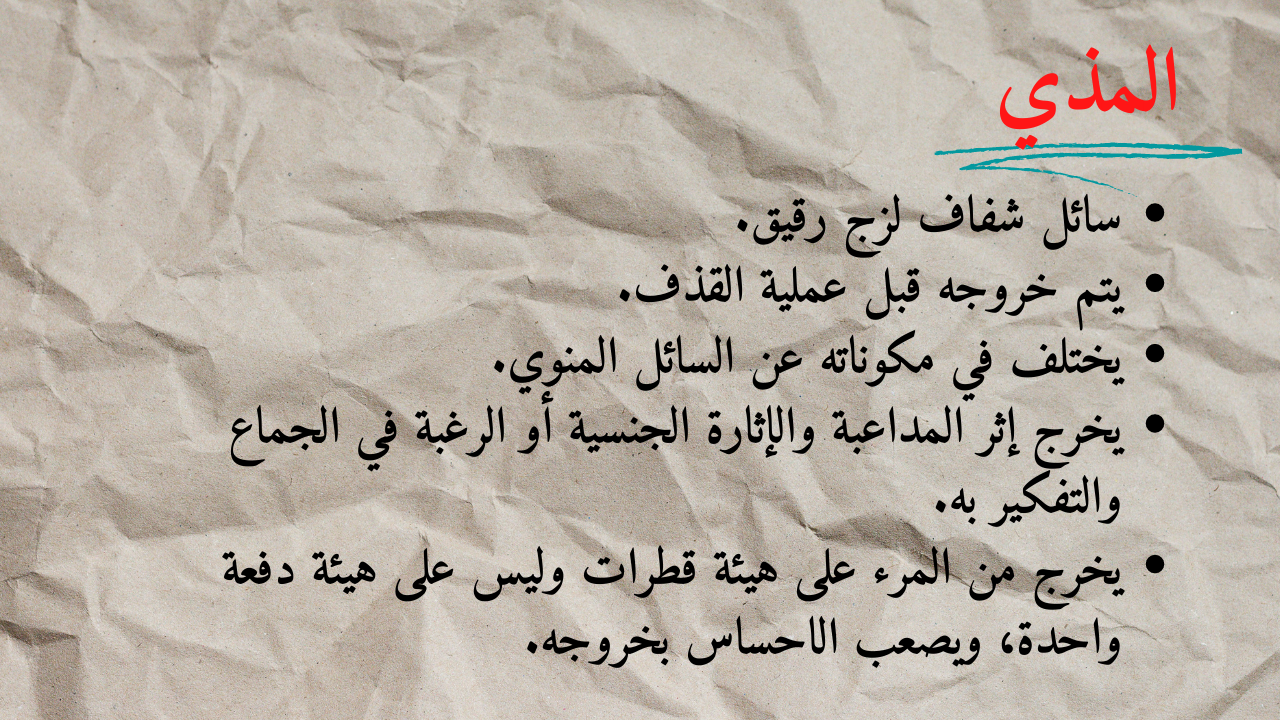 - في حين أن المذي يكون عبارة عن ماء رقيق لزج أبيض يخرج عند المداعبة أو النظر أو التخيلات الجنسية.