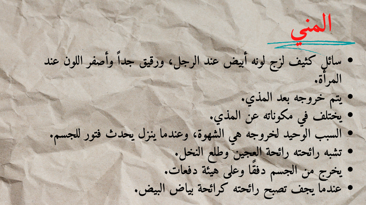 - أما المني فهو الماء الأبيض الغليظ الذي يخرج من الرجل في حين يكون رقيقاً أصفراً عند المرأة.
