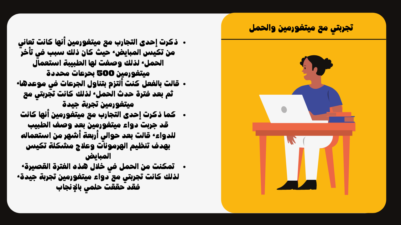 نسرد لكم مجموعة من تجارب الأخريات التي قمن بتناول علاج ميتفورمين لأجل المساعدة في حدوث الحمل، وحل مشكلات الخصوزبة التي تعاني منها الكثير من السيدات، وأصبحت أكثر شيوعاً، حيث يعمل هذا العلاج المنتشر بصورة كبيرة جداً بين السيدات على معالجة ضعف التبويض التي لا تساعد على حدوث العمل بصورة طبيعية، لهذا يسعى علاج ميتفورمين لمعالجة متلازمة تكيس المبايض بالتالي يساعد على ىحدوث الحمل، ومن هنا لكم تجارب السيدات التي جاءت على المنحى الآتي: