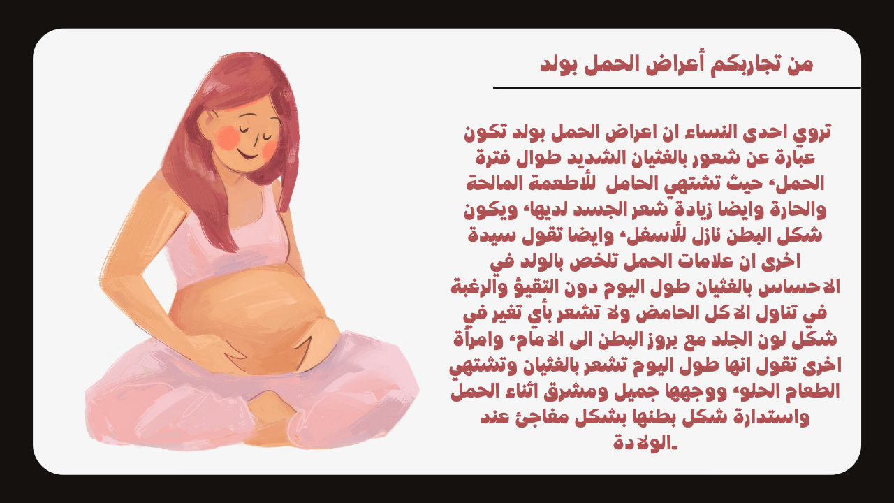 الحديث عن الحمل بولد يعني ترك المجال لتجارب الأخريات لذكر الكثير من المعلومات التي منها نستدل على أبرز علامات الحمل بولد، والتي نالت عليها السيدات من الخبرة في عدد مرات الحمل، علاوة عن الاختلاف في الأعراض المصاحبة للحمل ببنت أو بولد، لهذا السبب نرفق تشكيلة واسعة من هذه التجارب التي جاءت موضحة علامات الحمل بولد، منها: