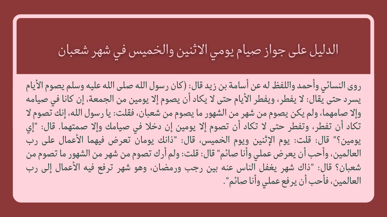 - الدليل على جواز صيام يومي الاثنين والخميس في شهر شعبان: